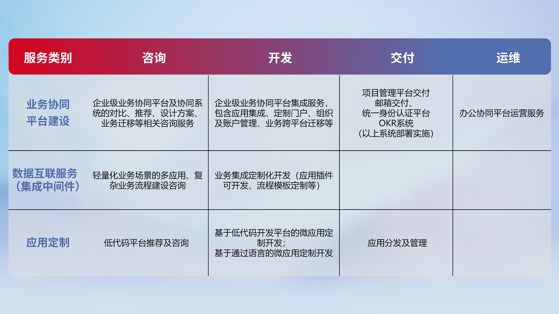 针对钉钉、、企微、、IDaas等平台级产品提供产品的规划、、、、方案、、交付、、、、定制化开发等服务,,,实现如统一协同办公、、、、智能客户服务、、混合会议管理、、、智能数据查询、、等业务场景,,,,实现数字化转型。。。。